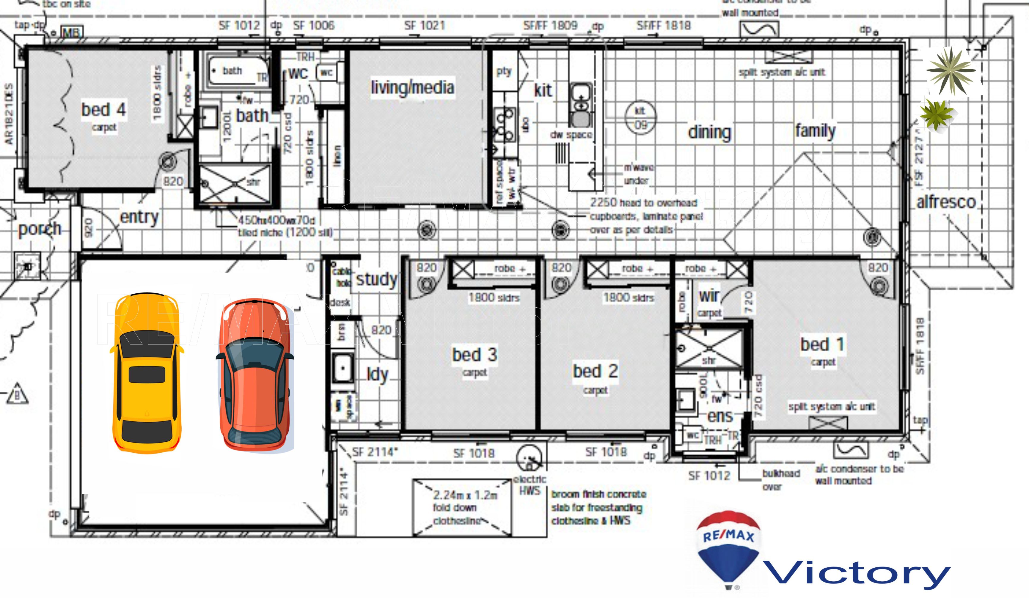 This perfect layout features two living areas: a large, carpeted media room with sliding doors, a built-in study nook, tiled and air-conditioned open plan living and dining, and a covered entertaining overlooking the lush, fenced yard.
