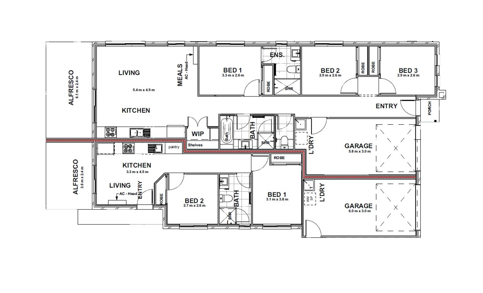 • One side: 3 bedrooms, 2 bathrooms